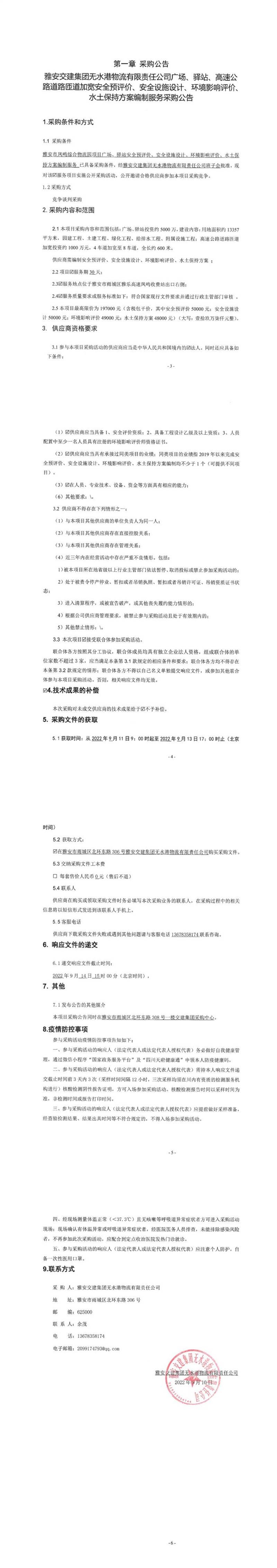 雅安交建集團(tuán)無(wú)水港物流有限責(zé)任公司廣場(chǎng)、驛站、高速公路道路匝道加寬安全預(yù)評(píng)價(jià)、安全設(shè)施設(shè)計(jì)、環(huán)境影響評(píng)價(jià)、水土保持方案編制服務(wù)采購(gòu)公告