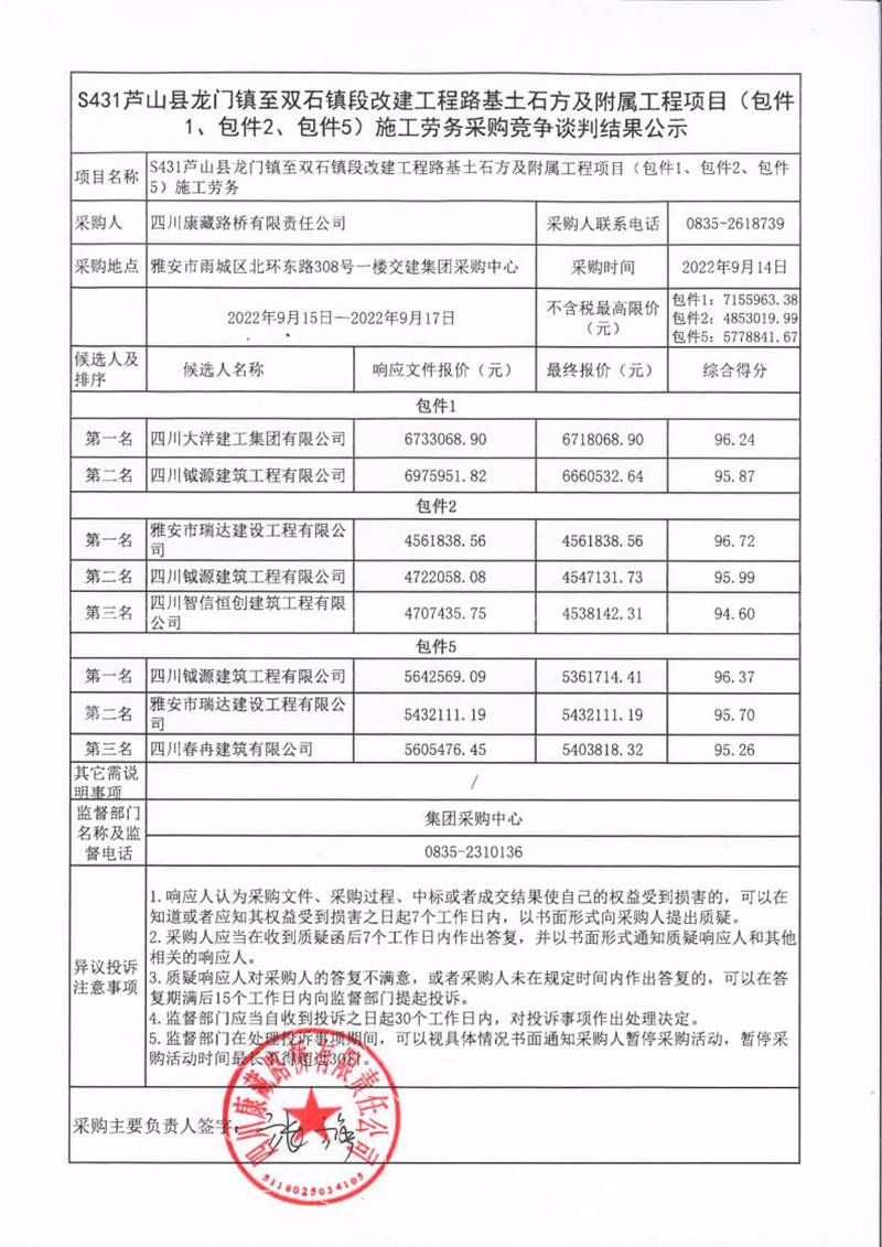 四川康藏路橋有限責(zé)任公司S431蘆山縣龍門鎮(zhèn)至雙石鎮(zhèn)段改建工程路基土石方及附屬工程項(xiàng)目(包件1、包件2、包件5)施工勞務(wù)采購競(jìng)爭(zhēng)談判結(jié)果公示