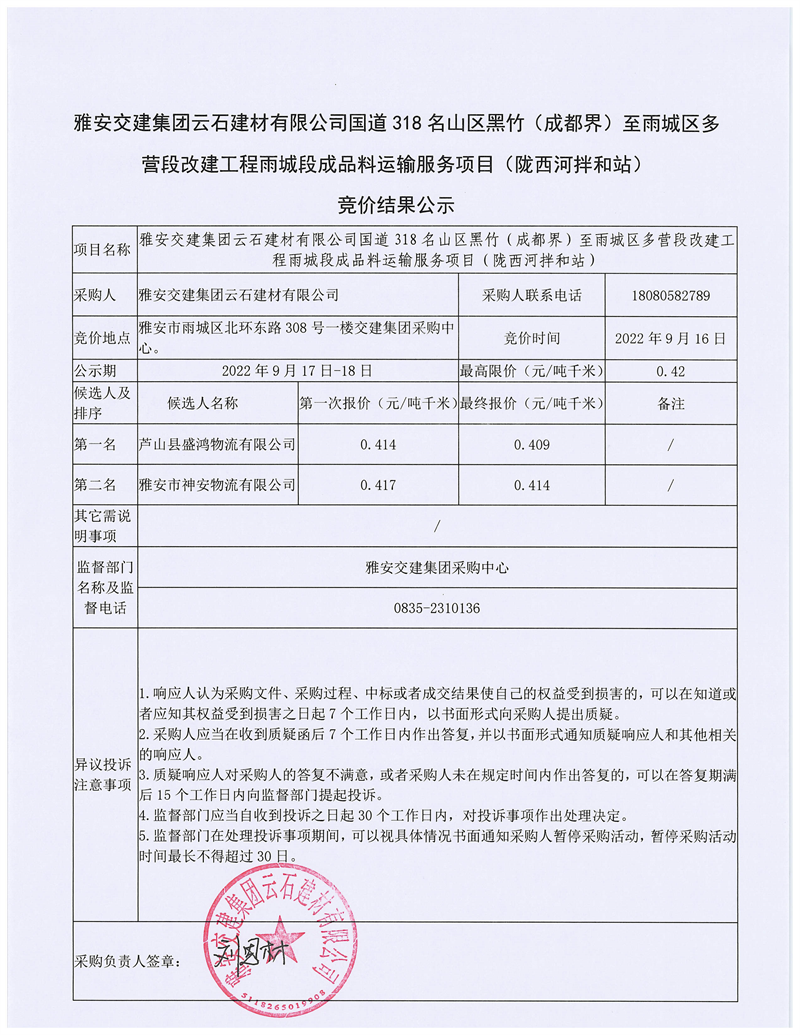 雅安交建集團云石建材有限公司國道318名山區(qū)黑竹(成都界)至雨城區(qū)多營段改建工程雨城段成品料運輸服務(wù)項目(隴西河拌和站)競價結(jié)果公示