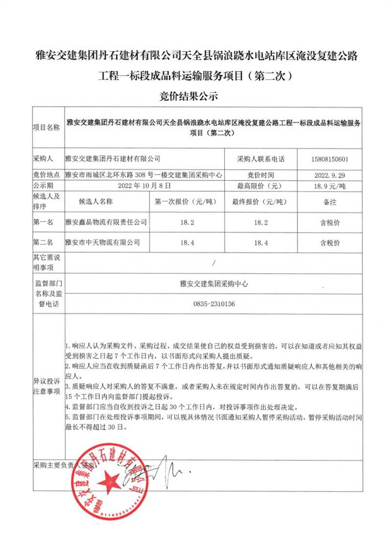 雅安交建集團(tuán)丹石建材有限公司天全縣鍋浪蹺水電站庫區(qū)淹沒復(fù)建公路工程一標(biāo)段成品料運(yùn)輸服務(wù)項目(第二次)競價結(jié)果公示