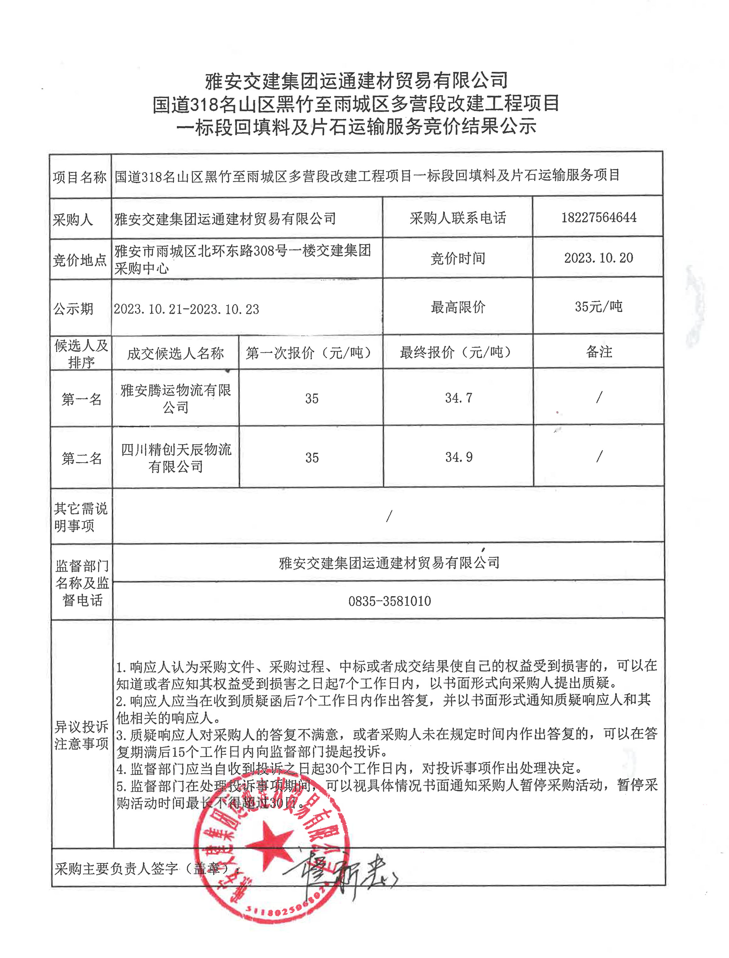 雅安交建集團運通建材貿(mào)易有限公司 國道318名山區(qū)黑竹至雨城區(qū)多營段改建工程項目一標段回填料及片石運輸服務競價結果公示