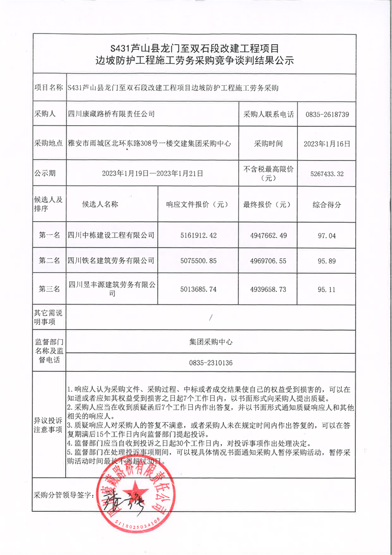 四川康藏路橋有限責(zé)任公司S431蘆山縣龍門至雙石段改建工程項(xiàng)目邊坡防護(hù)工程施工勞務(wù)采購競(jìng)爭(zhēng)談判結(jié)果公示