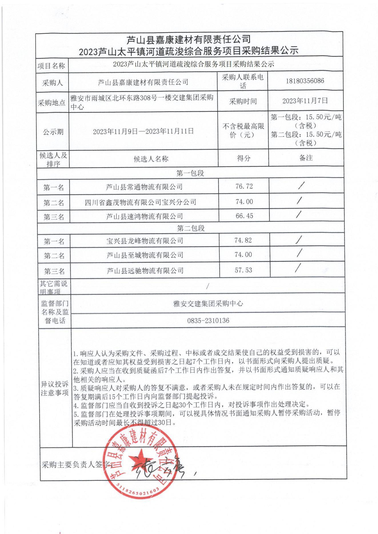 蘆山縣嘉康建材有限責任公司2023蘆山太平鎮(zhèn)河道疏浚綜合項目采購結(jié)果公示