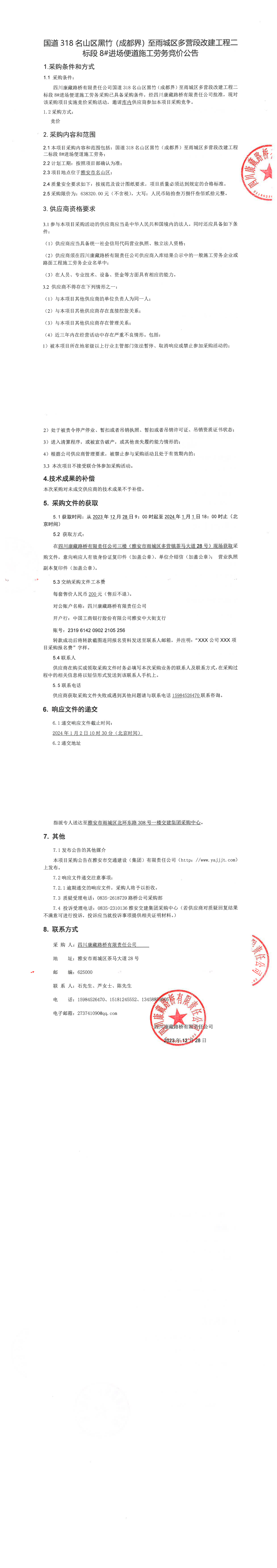 四川康藏路橋有限責(zé)任公司國道318名山區(qū)黑竹(成都界)至雨城區(qū)多營段改建工程二標段8#進場便道施工勞務(wù)競價公告