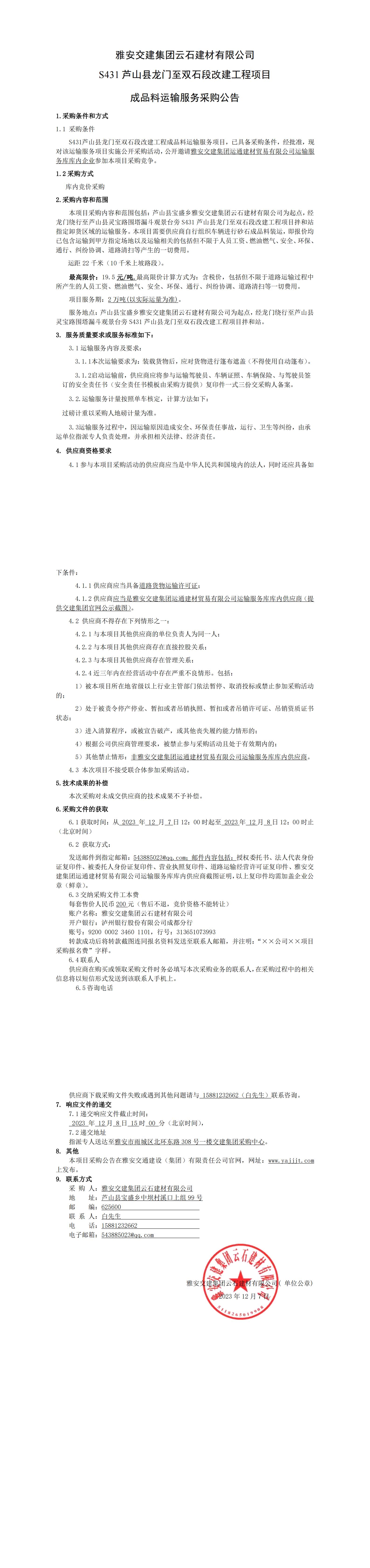 雅安交建集團(tuán)云石建材有限公司S431蘆山縣龍門至雙石段改建工程項(xiàng)目成品料運(yùn)輸服務(wù)采購公告