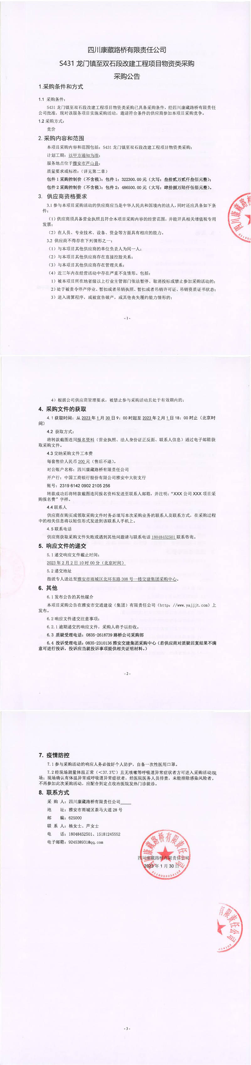 四川康藏路橋有限責(zé)任公司S431龍門(mén)鎮(zhèn)至雙石段改建工程項(xiàng)目物資類(lèi)采購(gòu)采購(gòu)公告