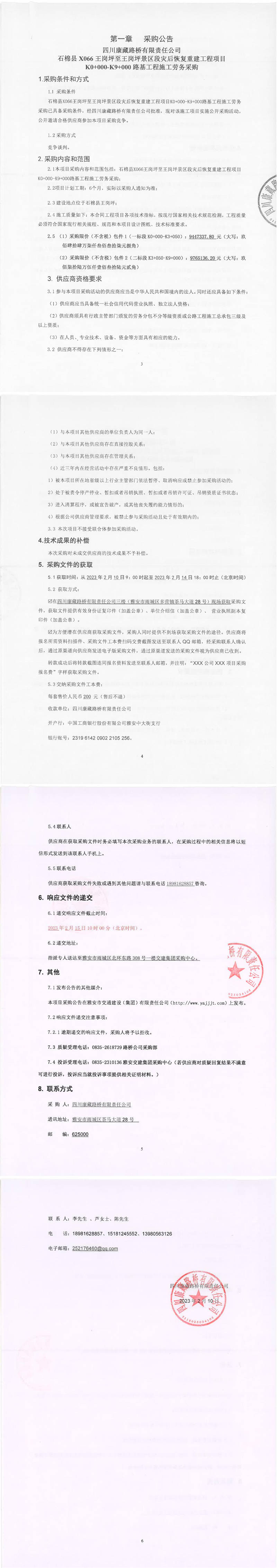 四川康藏路橋有限責任公司石棉縣X066王崗坪至王崗坪景區(qū)段災后恢復重建工程項目K0+000-K9+000路基工程施工勞務采購采購公告
