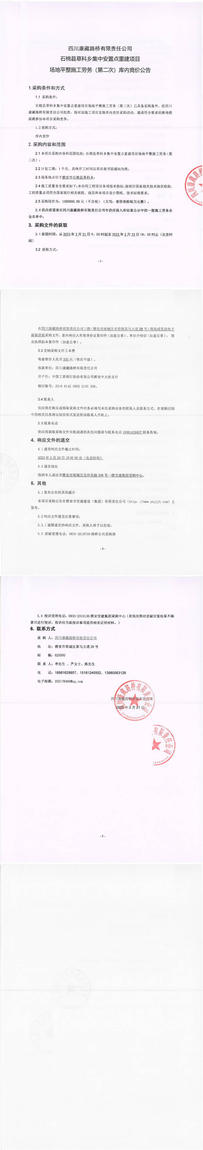 四川康藏路橋有限責(zé)任公司石棉草科鄉(xiāng)集中安置點(diǎn)重建項(xiàng)目場(chǎng)地平整施工勞務(wù)(第二次)庫內(nèi)競(jìng)價(jià)公告