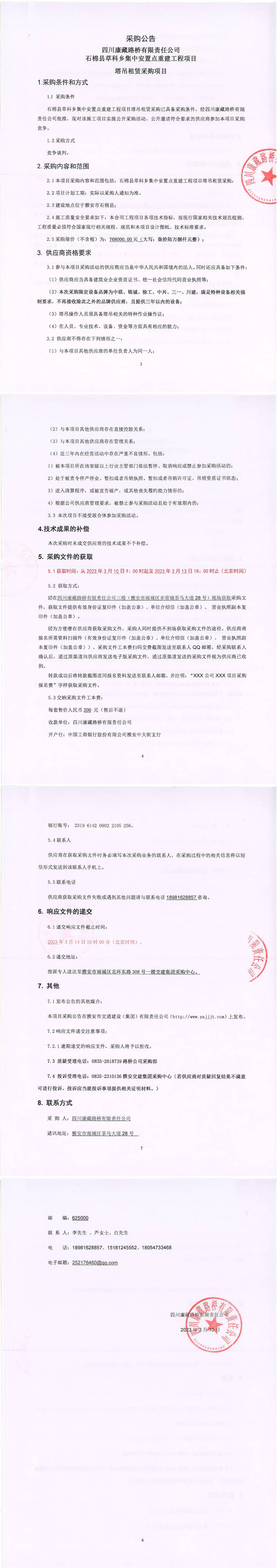 四川康藏路橋有限責任公司石棉縣草科鄉(xiāng)集中安置點重建工程項目塔吊租賃采購公告