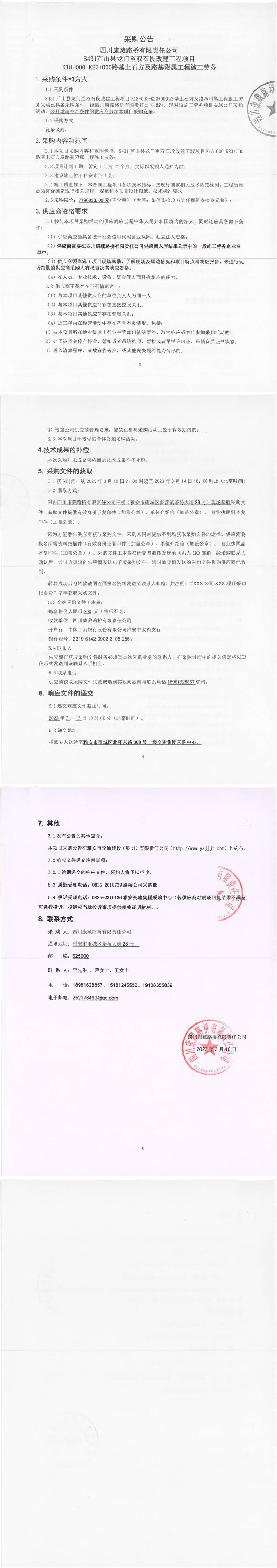 四川康藏路橋有限責(zé)任公司S431蘆山縣龍門(mén)至雙石段改建工程項(xiàng)目K18+000-K23+000路基土石方及路基附屬工程施工勞務(wù)采購(gòu)公告