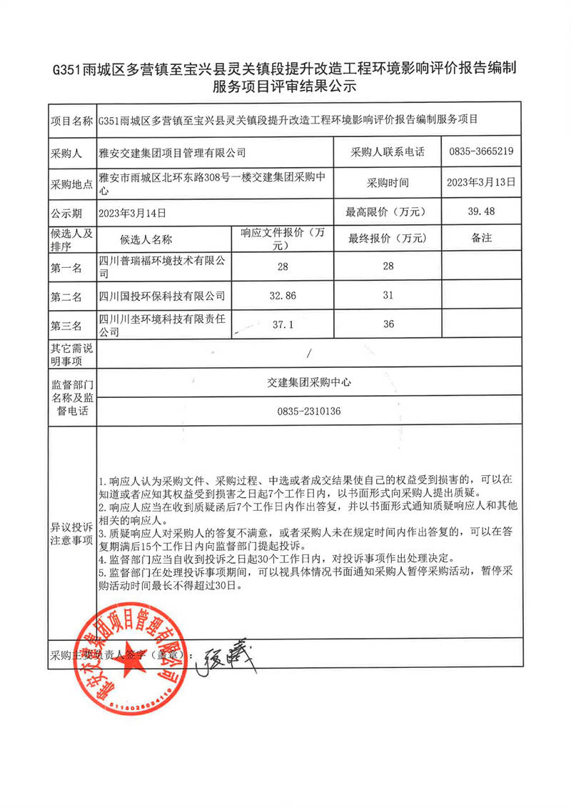 雅安交建集團(tuán)項(xiàng)目管理有限公司G351雨城區(qū)多營鎮(zhèn)至寶興縣靈關(guān)鎮(zhèn)段提升改造工程環(huán)境影響評價(jià)報(bào)告編制服務(wù)項(xiàng)目結(jié)果公示