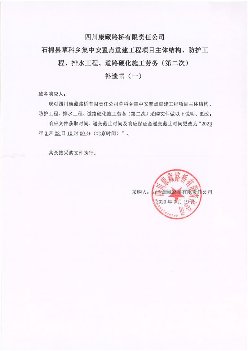 四川康藏路橋有限責(zé)任公司石棉縣草科鄉(xiāng)集中安置點重建工程項目主體結(jié)構(gòu)、防護工程、排水工程、道路硬化施工勞務(wù)(第二次)補遺書(一)