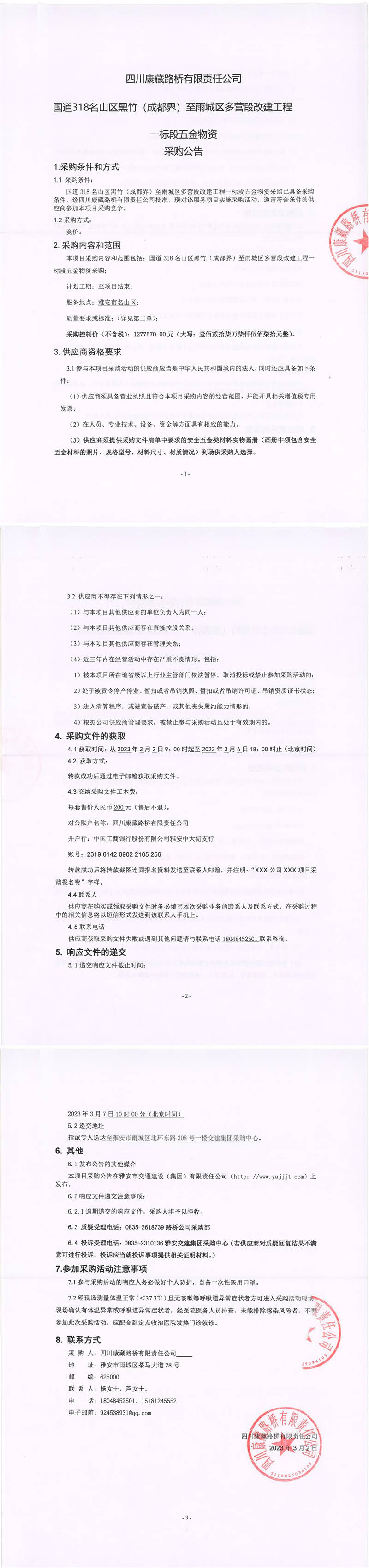 四川康藏路橋有限責(zé)任公司國道318名山區(qū)黑竹(成都界)至雨城區(qū)多營段改建工程一標段五金物資采購公告