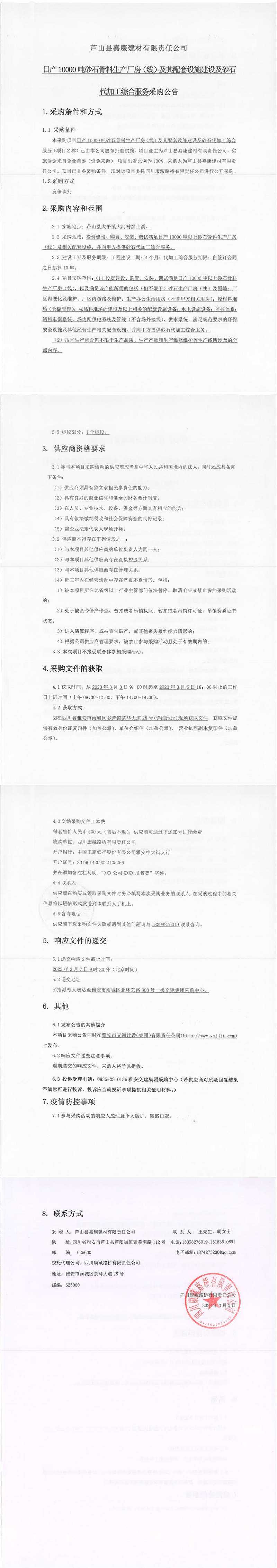 蘆山縣嘉康嘉康建材有限責(zé)任公司日產(chǎn)10000噸砂石骨料生產(chǎn)廠房(線)及其配套設(shè)施建設(shè)及砂石代加工綜合服務(wù)采購(gòu)公告