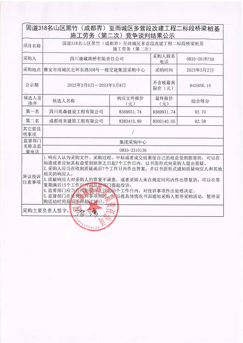 四川康藏路橋有限責(zé)任公司國道318名山區(qū)黑竹(成都界)至雨城區(qū)多營段改建工程二標(biāo)段橋梁樁基施工勞務(wù)(第二次)競爭談判結(jié)果公示