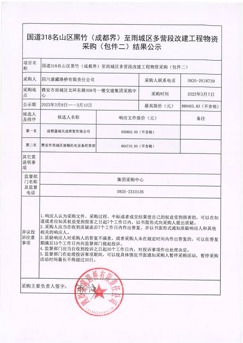 四川康藏路橋有限責(zé)任公司國(guó)道318名山區(qū)黑竹(成都界)至雨城區(qū)多營(yíng)段改建工程物資采購(gòu)(包件二)結(jié)果公示