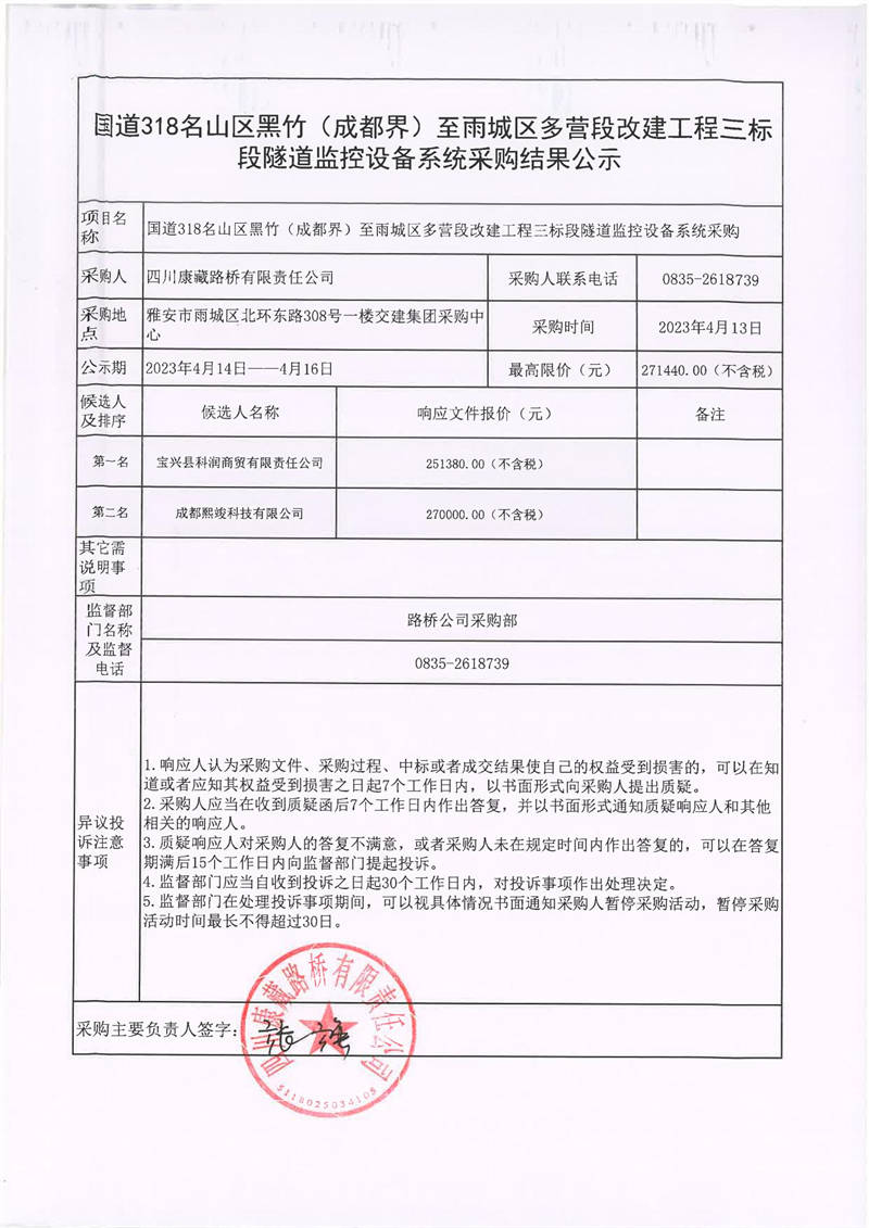 四川康藏路橋有限責(zé)任公司國(guó)道318名山區(qū)黑竹(成都界)至雨城區(qū)多營(yíng)段改建工程三標(biāo)段隧道監(jiān)控設(shè)備系統(tǒng)采購(gòu)結(jié)果公示