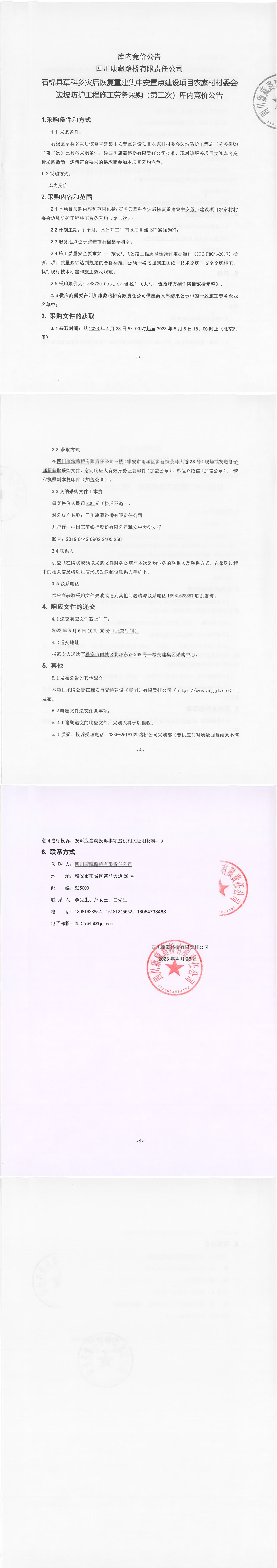 四川康藏路橋有限責任公司石棉草科鄉(xiāng)災(zāi)后恢復重建集中安置點建設(shè)項目農(nóng)家村村委會邊坡防護工程施工勞務(wù)采購(第二次)庫內(nèi)競價公告