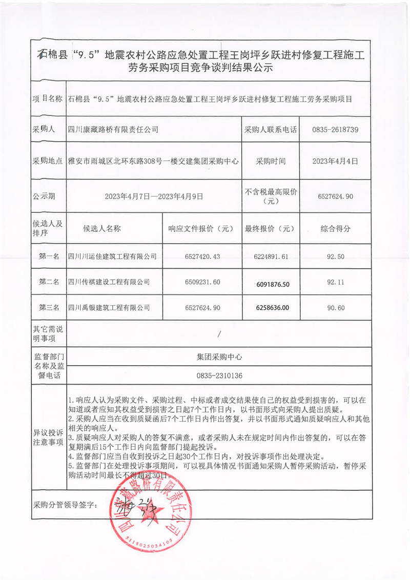 四川康藏路橋有限責任公司石棉縣“9.5”地震農村公路應急處置工程王崗坪鄉(xiāng)躍進村修復工程施工勞務采購項目競爭談判結果公示