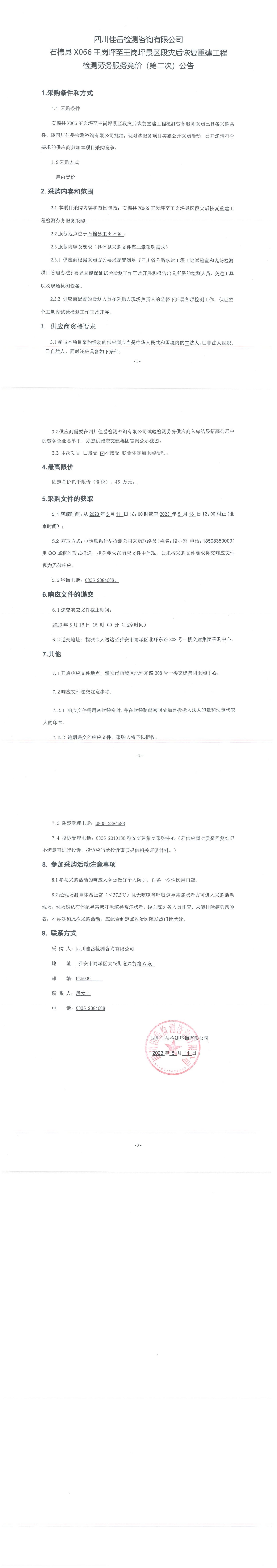 四川佳岳檢測(cè)咨詢有限公司石棉縣X066王崗坪至王崗坪景區(qū)段災(zāi)后恢復(fù)重建工程檢測(cè)勞務(wù)服務(wù)競(jìng)價(jià)(第二次)采購(gòu)公告