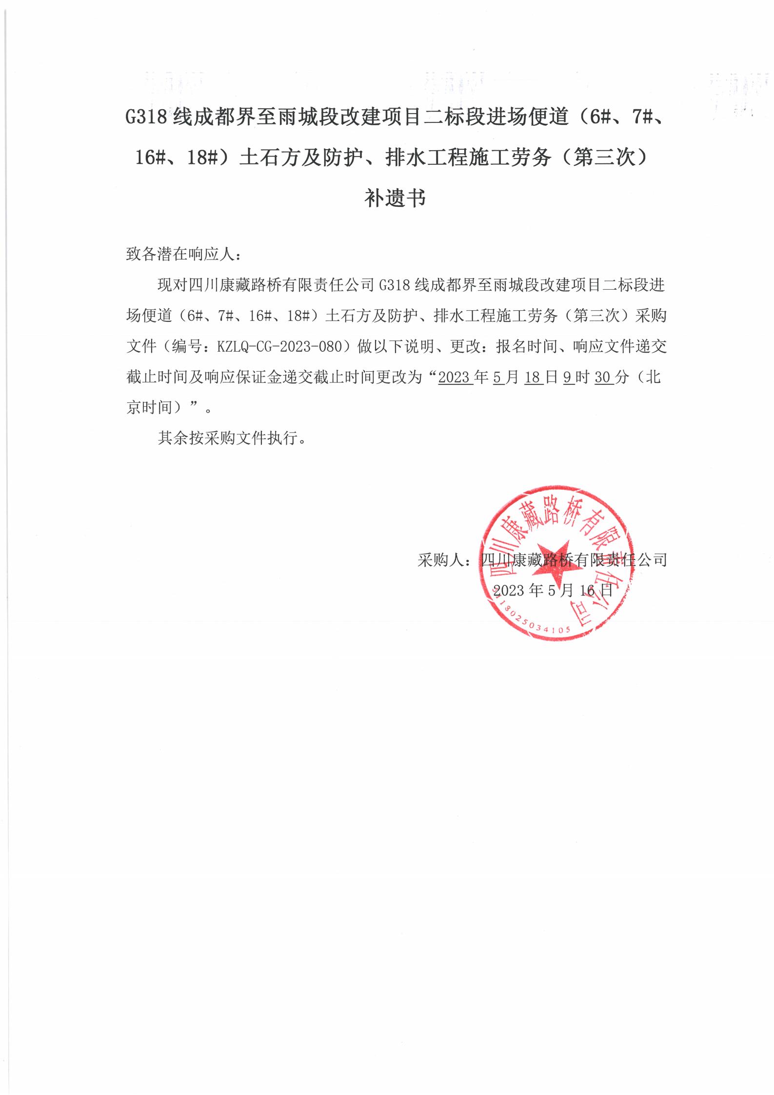 四川康藏路橋有限責任公司G318線成都至雨城段改建項目二標段進場便道(6#、7#、16#、18#)土石方及防護、排水工程施工勞務(第三次)補遺書