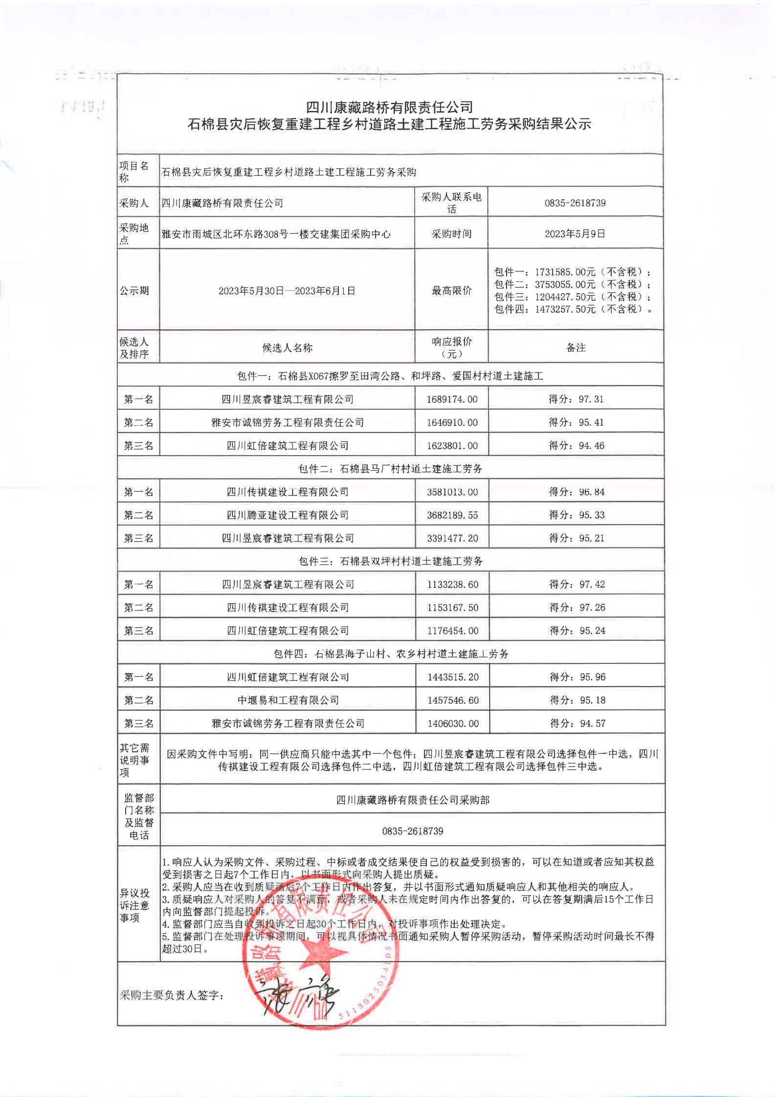 四川康藏路橋有限責(zé)任公司石棉縣災(zāi)后恢復(fù)重建工程鄉(xiāng)村道路土建工程施工勞務(wù)采購結(jié)果公示