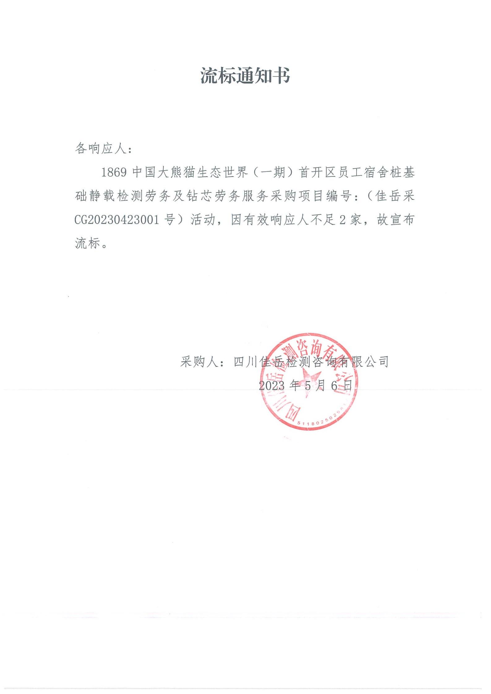 四川佳岳檢測(cè)咨詢有限公司1869中國(guó)大熊貓生態(tài)世界(一期)首開(kāi)區(qū)員工宿舍樁基礎(chǔ)靜載檢測(cè)勞務(wù)及磚芯庫(kù)勞務(wù)服務(wù)流標(biāo)通知
