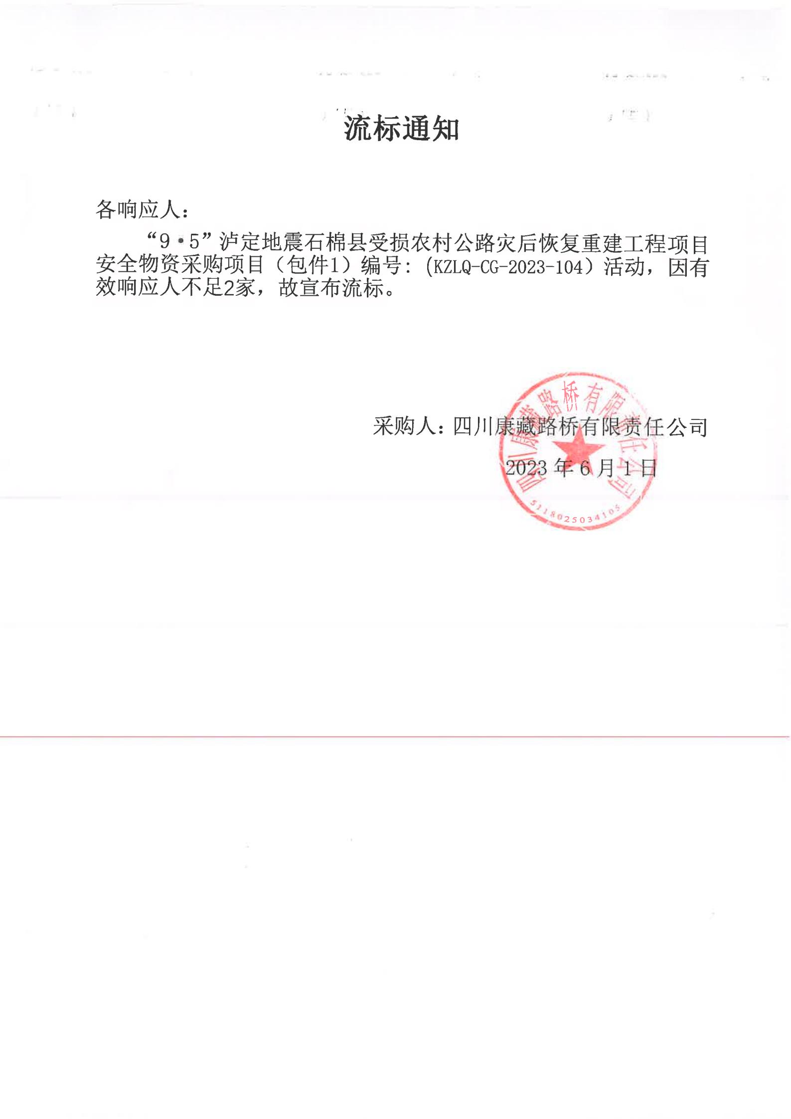 四川康藏路橋有限責任公司“9·5”瀘定地震石棉縣受損農(nóng)村公路災(zāi)后恢復重建工程項目安全物資項目(包件1)流標通知
