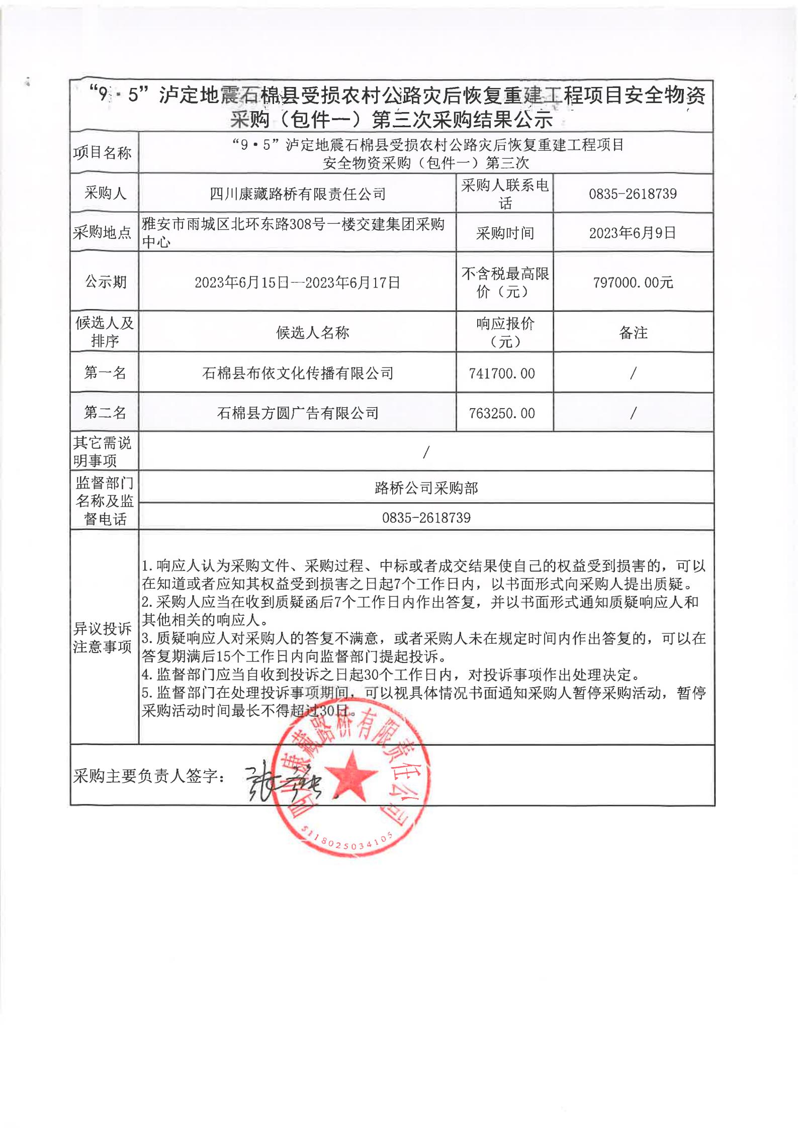 四川康藏路橋有限責任公司“9·5”瀘定地震石棉縣農村公路災后恢復重建工程項目安全物資采購(包件一)第三次采購結果公示