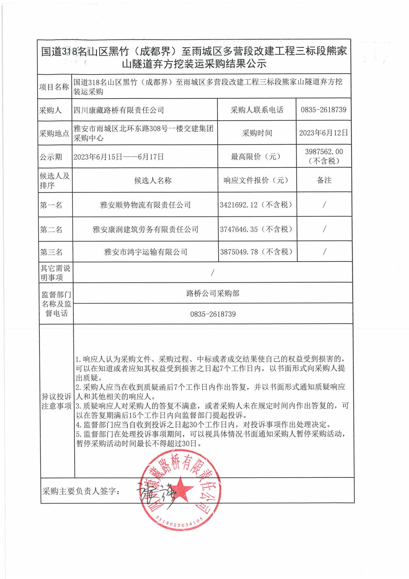 四川康藏路橋有限責(zé)任公司國道318名山區(qū)黑竹(成都界)至雨城區(qū)多營段改建工程三標段熊家山隧道棄方挖裝運采購結(jié)果公示