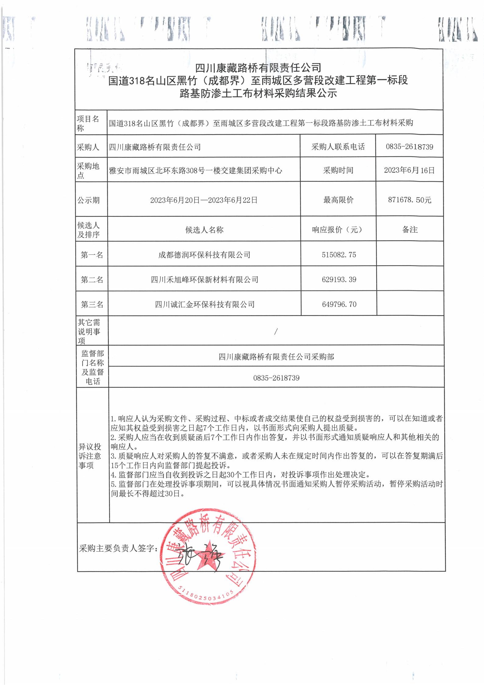 四川康藏路橋有限責任公司國道318名山區(qū)黑竹(成都界)至雨城區(qū)多營段改建工程第一標段路基防滲土工布材料采購結(jié)果公示