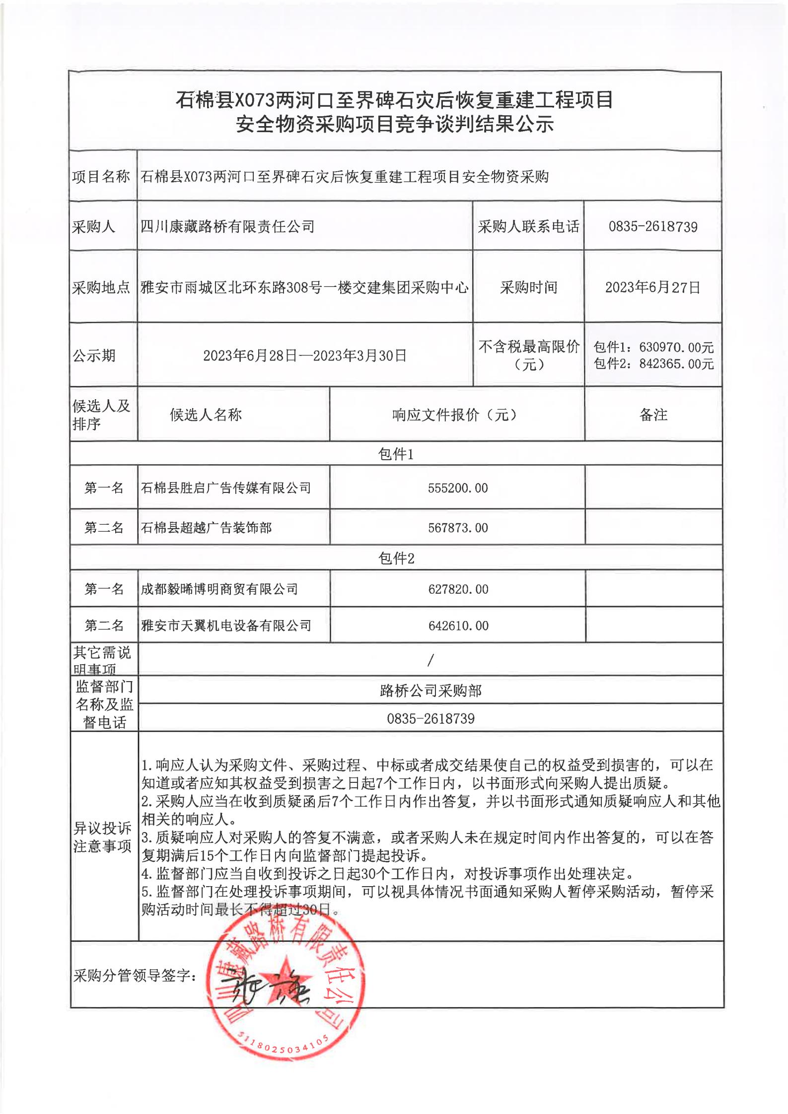 四川康藏路橋有限責(zé)任公司石棉縣X073兩河口至界碑石災(zāi)后恢復(fù)重建工程項(xiàng)目安全物資采購(gòu)項(xiàng)目競(jìng)爭(zhēng)談判結(jié)果公示