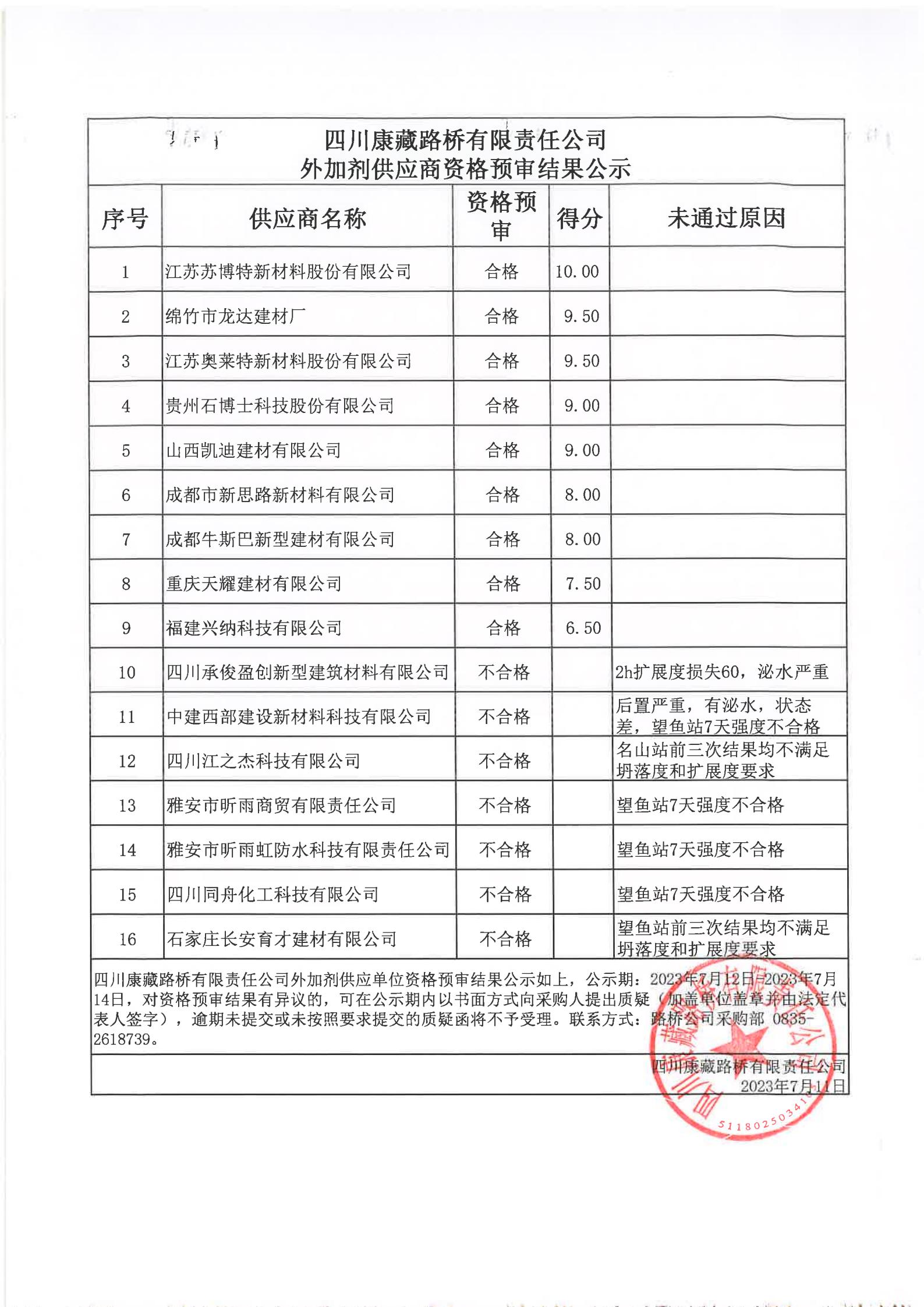 四川康藏路橋有限責任公司外加劑供應商資格預審結果公示