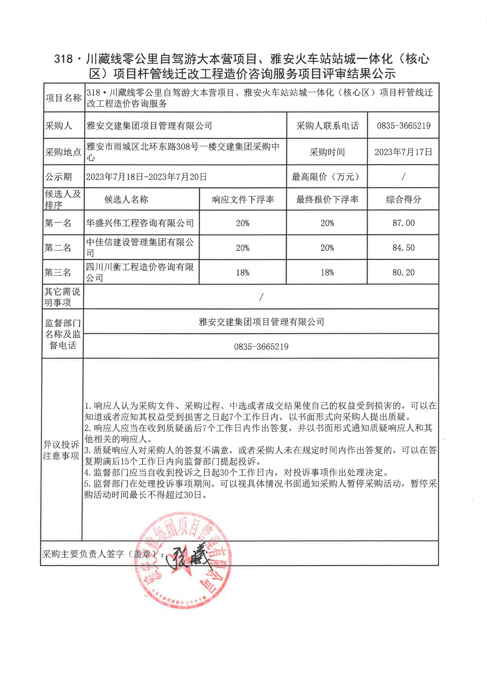 雅安交建集團項目管理有限公司318·川藏公路零公里自駕游大本營項目、雅安火車站站城一體化(核心區(qū))項目桿管線遷改工程造價咨詢服務項目評審結(jié)果公示