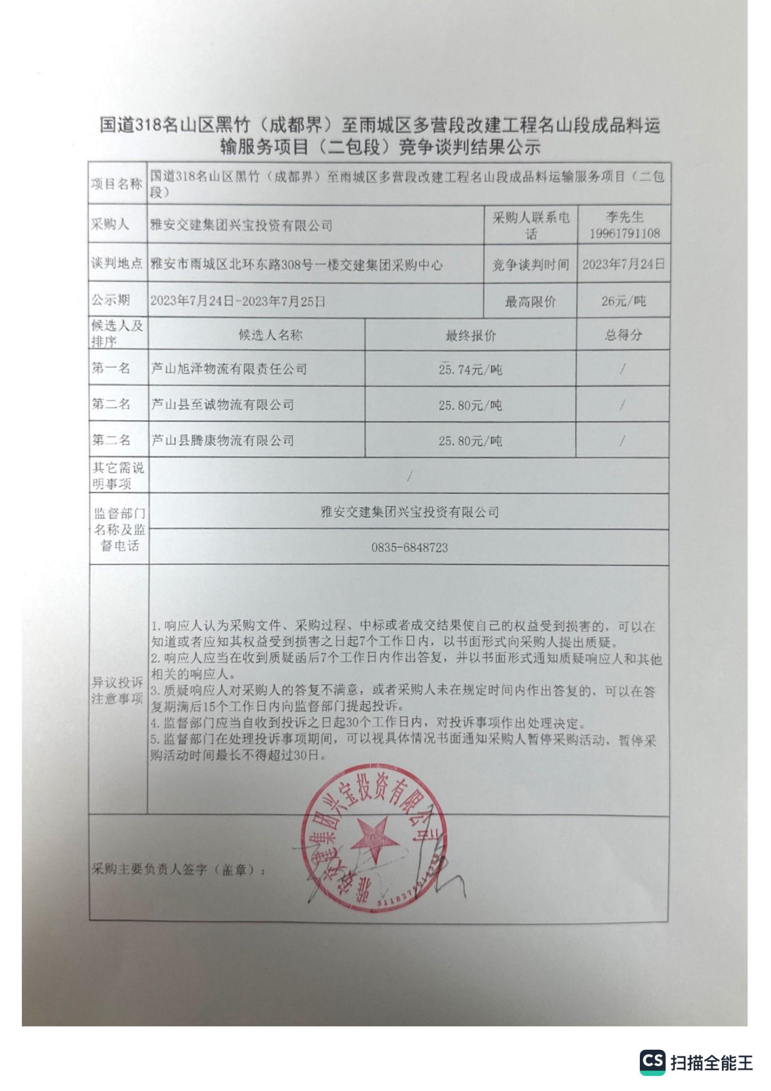 雅安交建集團(tuán)興寶投資有限公司國(guó)道318名山區(qū)黑竹(成都界)至雨城區(qū)多營(yíng)段改建工程名山段成品料運(yùn)輸服務(wù)項(xiàng)目(二包段)競(jìng)爭(zhēng)談判結(jié)果公示