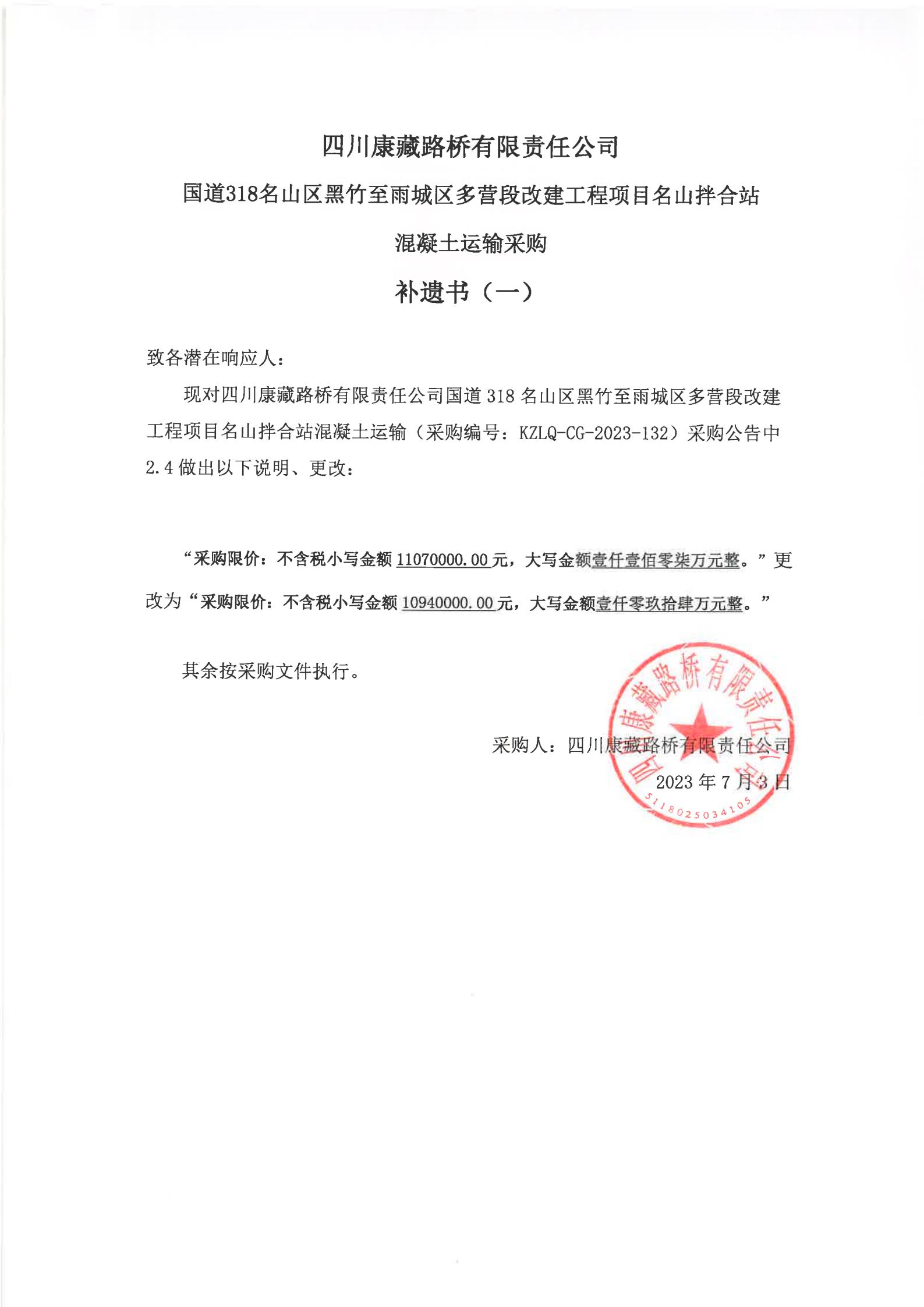 四川康藏路橋有限責(zé)任公司國道318名山區(qū)黑竹至雨城區(qū)多營段改建工程項目名山拌合站混凝土運(yùn)輸服務(wù)采購補(bǔ)遺書
