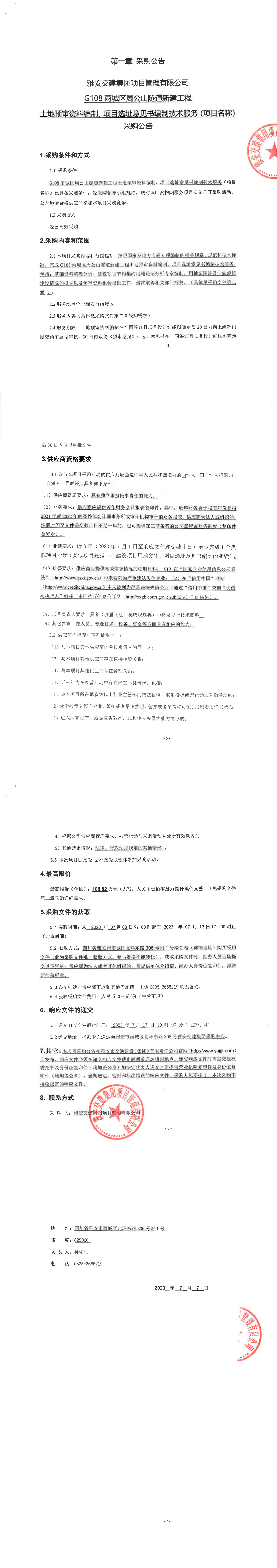 雅安交建集團項目管理有限公司G108雨城區(qū)周公山隧道新建工程土地預(yù)審資料編制、項目選址意見書編制技術(shù)服務(wù)(項目名稱)采購公告