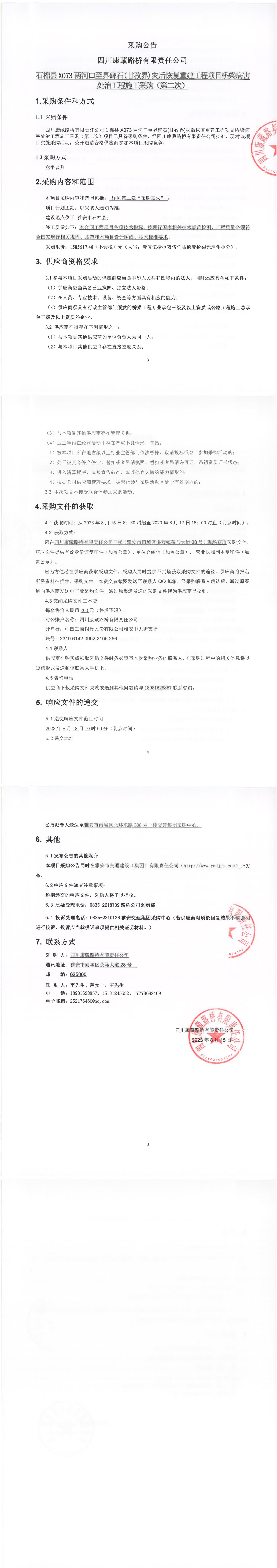 四川康藏路橋有限責(zé)任公司石棉縣X703兩河口至界碑石(甘孜界)災(zāi)后恢復(fù)重建工程項目橋梁病害處治工程施工采購(第二次)