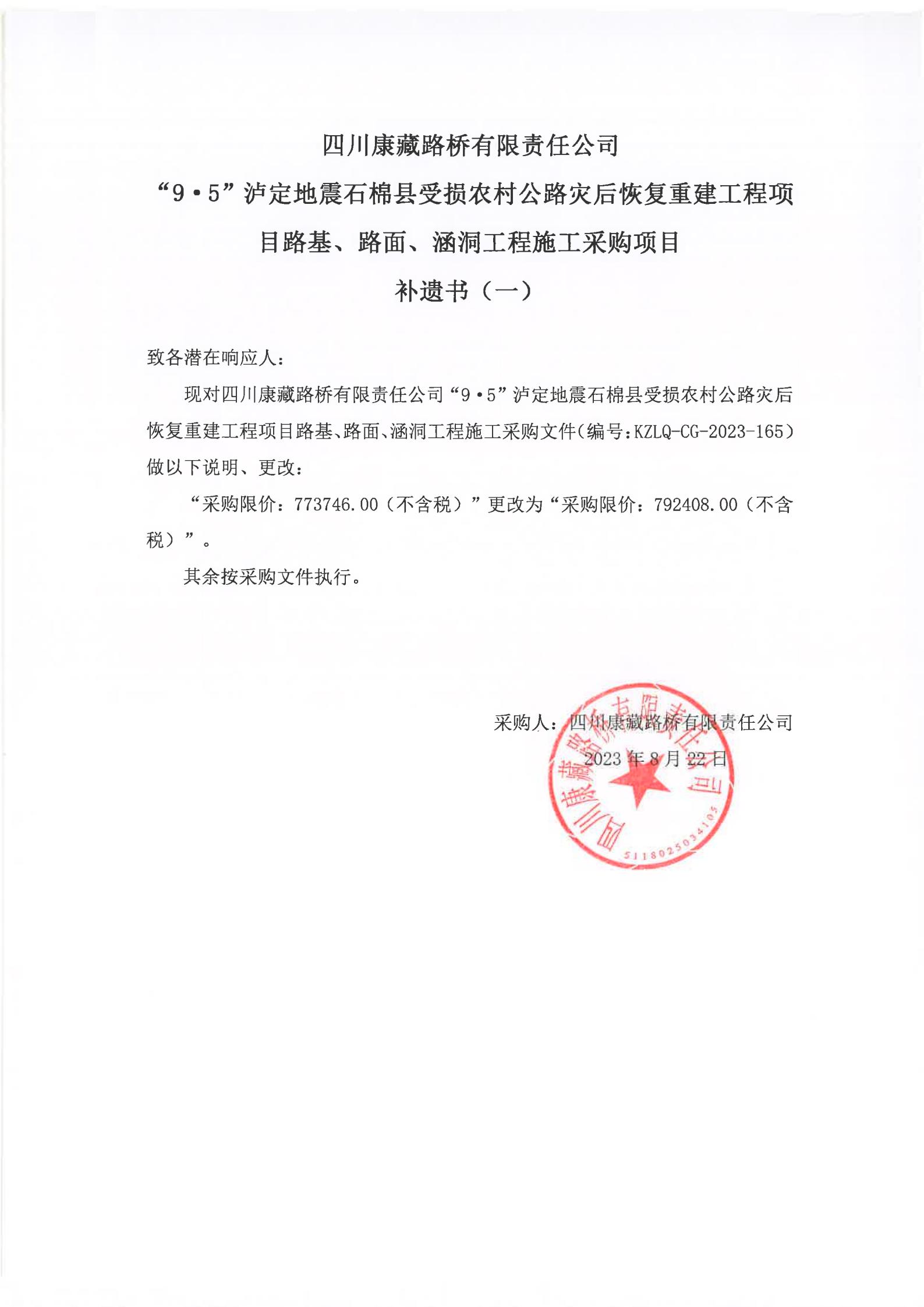 四川康藏路橋有限責(zé)任公司“9·5”瀘定地震石棉縣受損農(nóng)村公路災(zāi)后恢復(fù)重建工程項(xiàng)目路基、路面、涵洞工程施工采購項(xiàng)目補(bǔ)遺書(一)