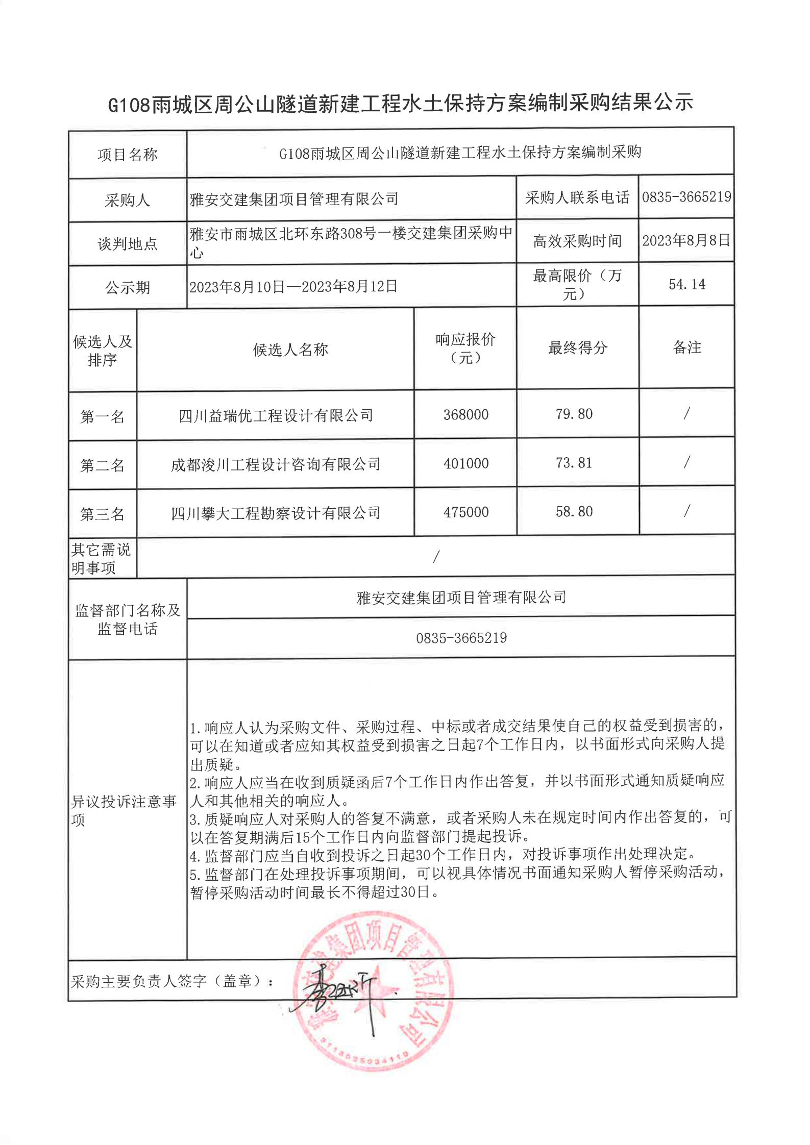 雅安交建集團項目管理有限公司G108雨城區(qū)周公山隧道新建工程水土保持方案編制采購結(jié)果公示