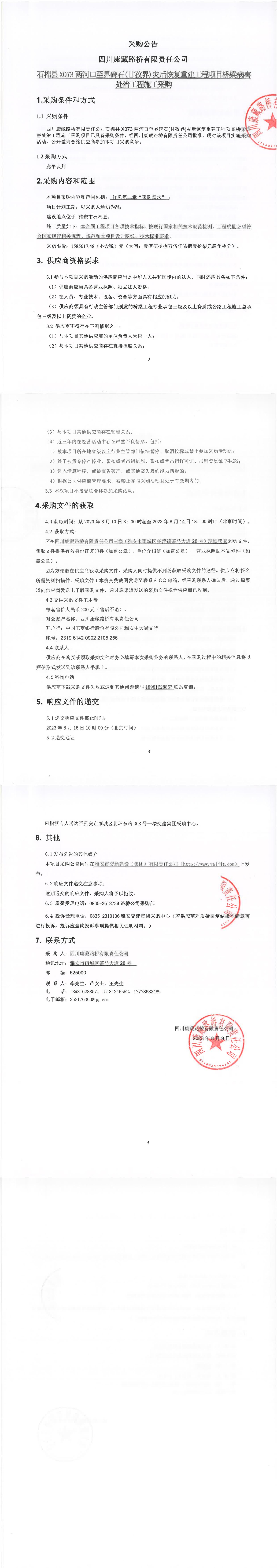 四川康藏路橋有限責(zé)任公司石棉縣X073兩河口至界碑石(甘孜界)災(zāi)后恢復(fù)重建工程項(xiàng)目橋梁病害處治工程施工采購(gòu)
