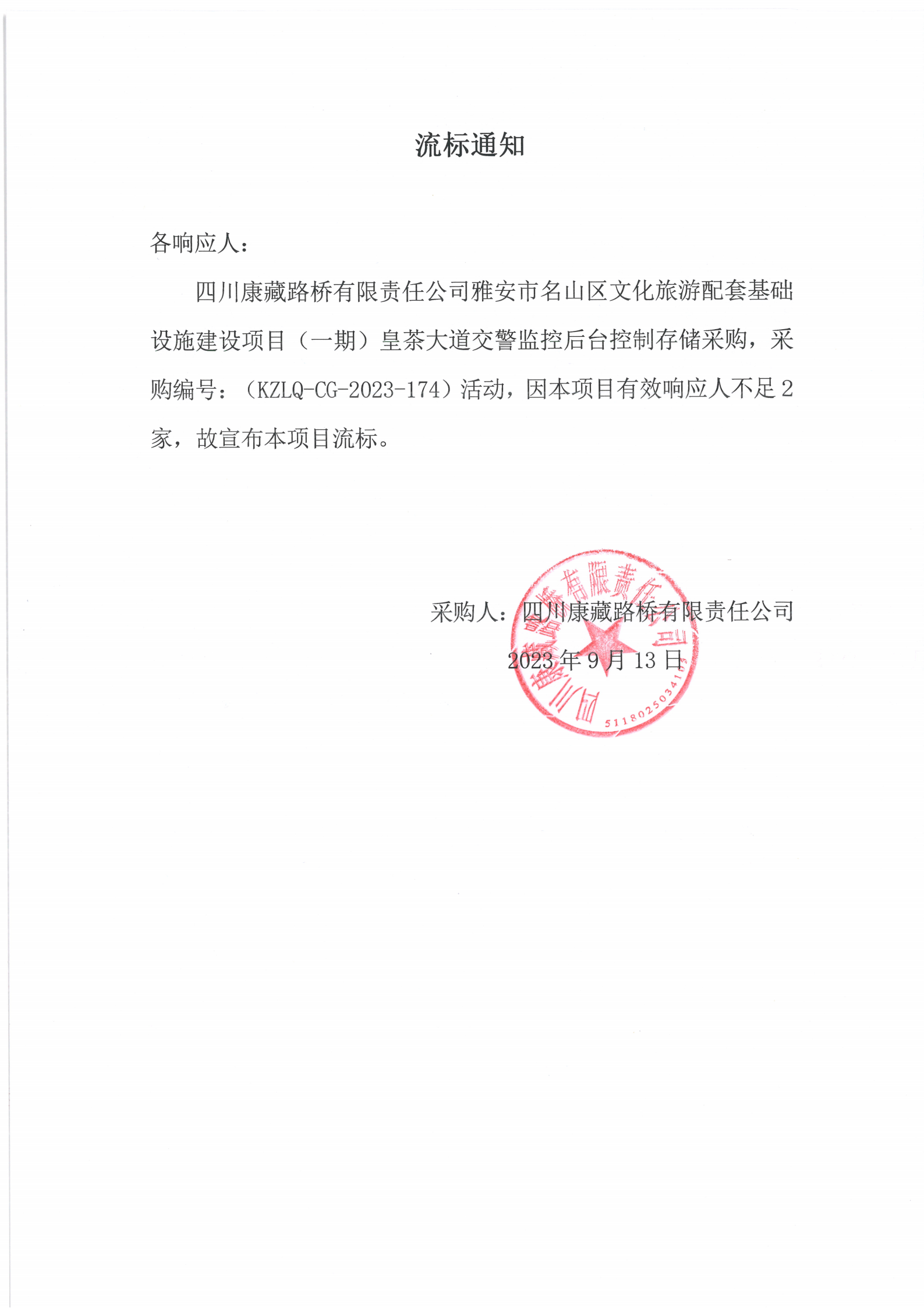 四川康藏路橋有限責(zé)任公司雅安市名山區(qū)文化旅游配套基礎(chǔ)設(shè)施建設(shè)項目(一期)皇茶大道交警監(jiān)控后臺控制存儲采購流標通知