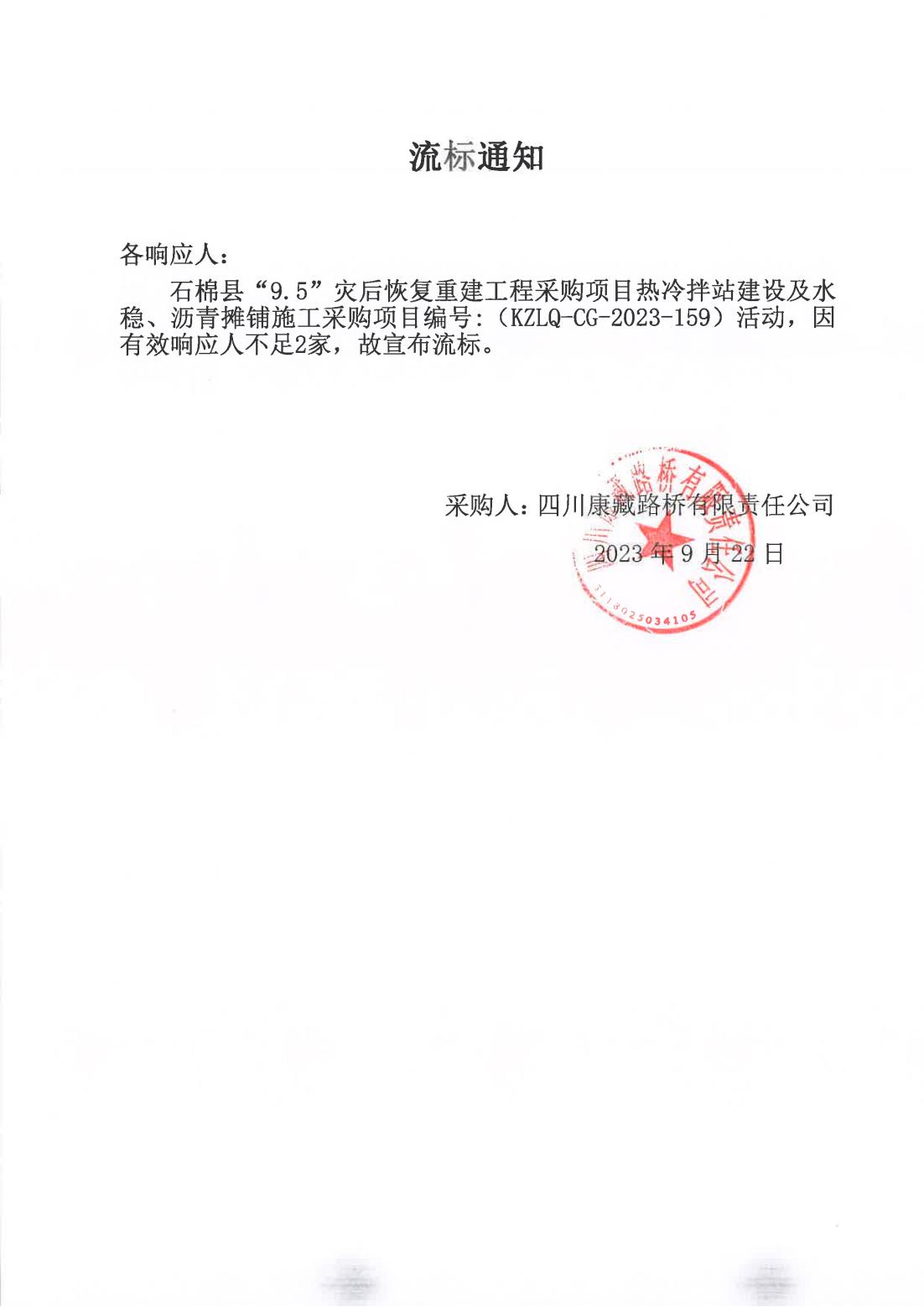 四川康藏路橋有限責(zé)任公司石棉縣“9·5”災(zāi)后恢復(fù)重建工程采購(gòu)項(xiàng)目熱冷拌站建設(shè)及水穩(wěn)、瀝青攤鋪施工采購(gòu)流標(biāo)通知