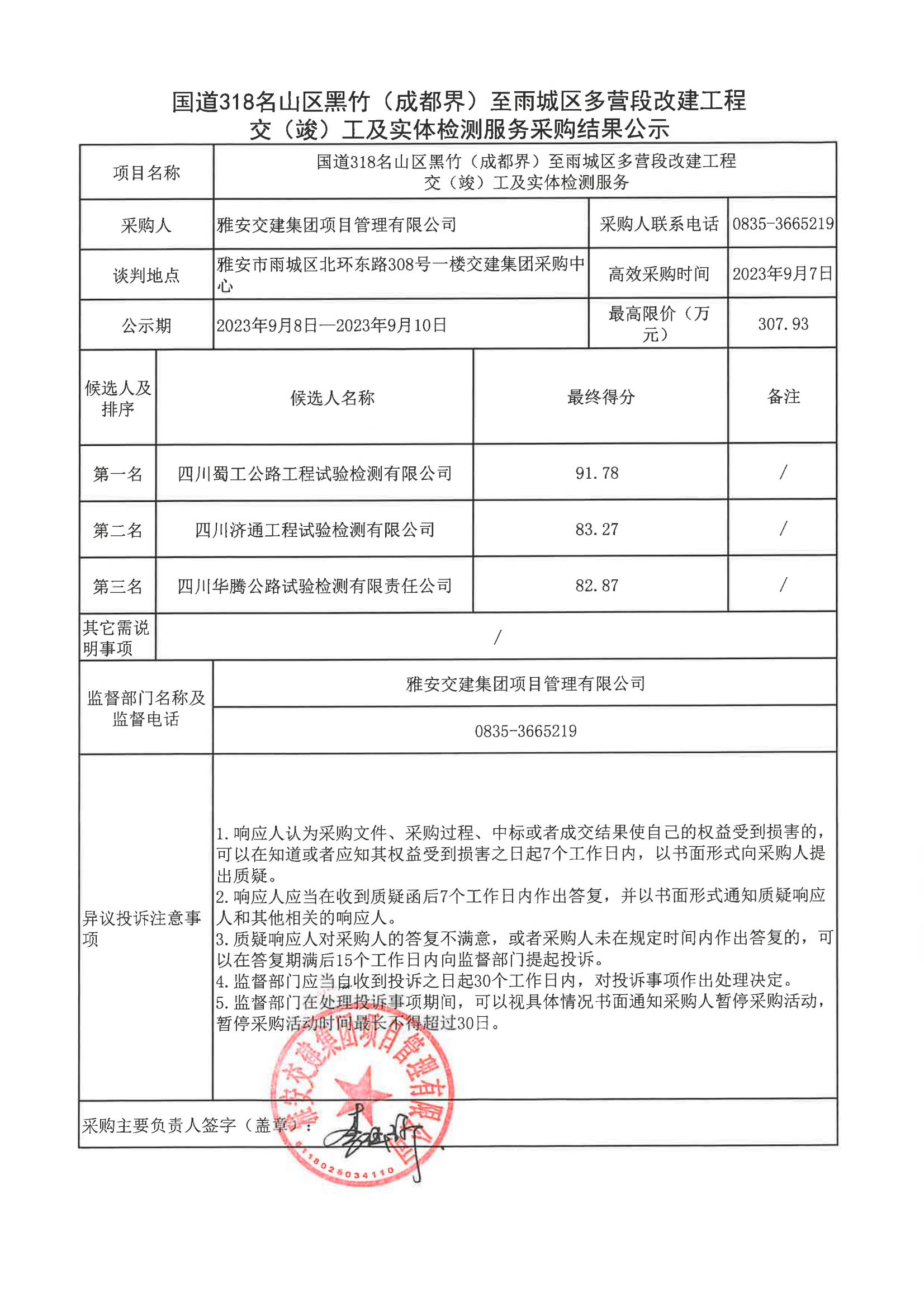 雅安交建集團(tuán)項目管理有限公司國道318名山區(qū)黑竹(成都界)至雨城區(qū)多營段改建工程交(竣)工及實體檢測服務(wù)采購結(jié)果公示