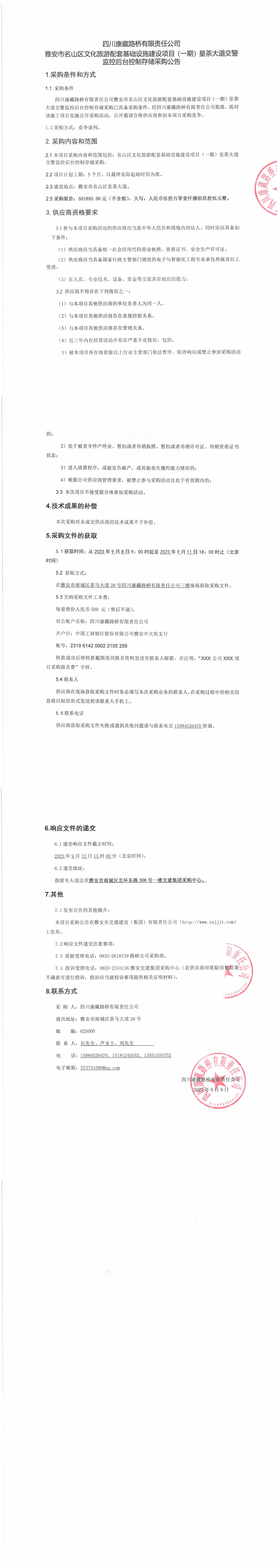 四川康藏路橋有限責任公司雅安市名山區(qū)文化旅游配套基礎設施建設項目(一期)皇茶大道交警監(jiān)控后臺控制存儲采購公告