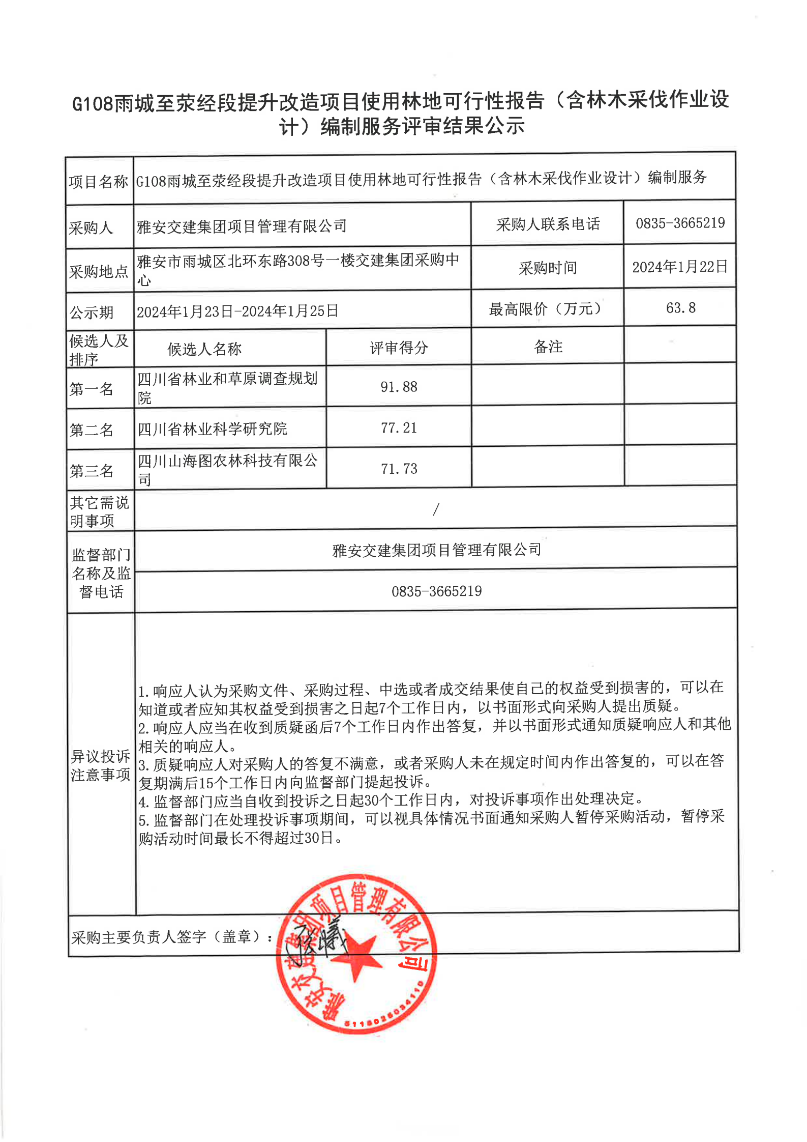雅安交建集團項目管理有限公司G108雨城至滎經段提升改造項目使用林地可行性報告(含林木采伐作業(yè)設計)編制服務評審結果公示