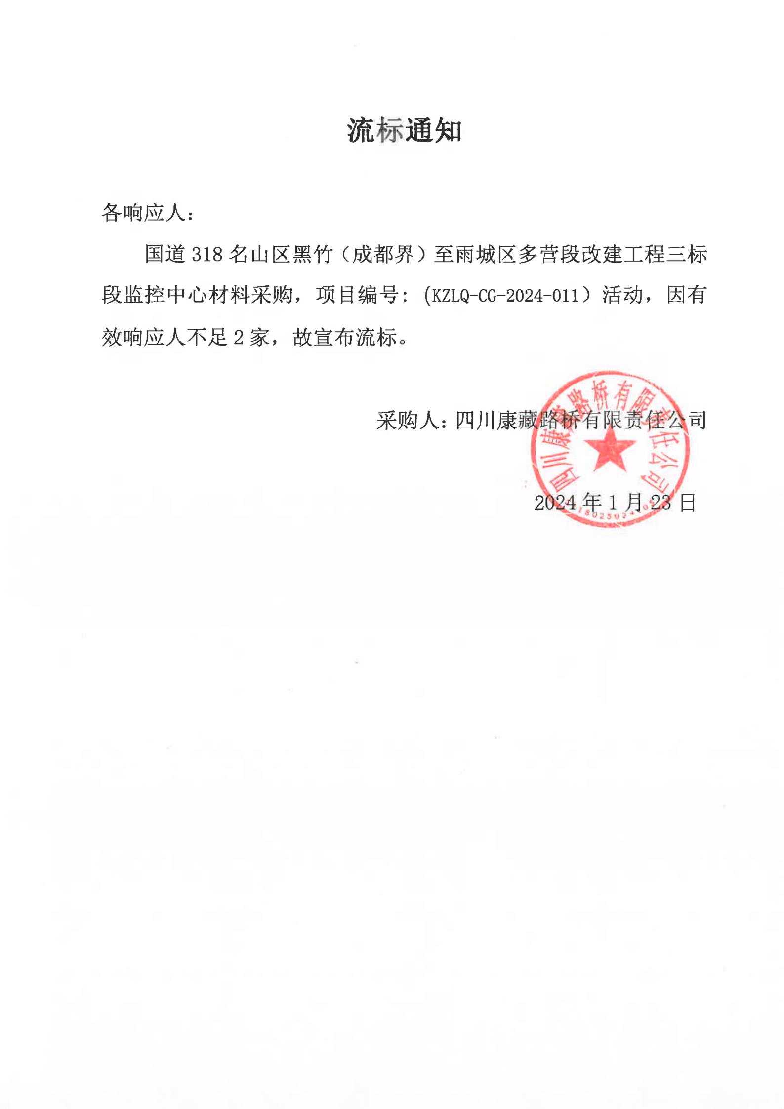 四川康藏路橋有限責(zé)任公司國(guó)道318名山區(qū)黑竹(成都界)至雨城區(qū)多營(yíng)段改建工程三標(biāo)段監(jiān)控中心材料采購(gòu)流標(biāo)通知
