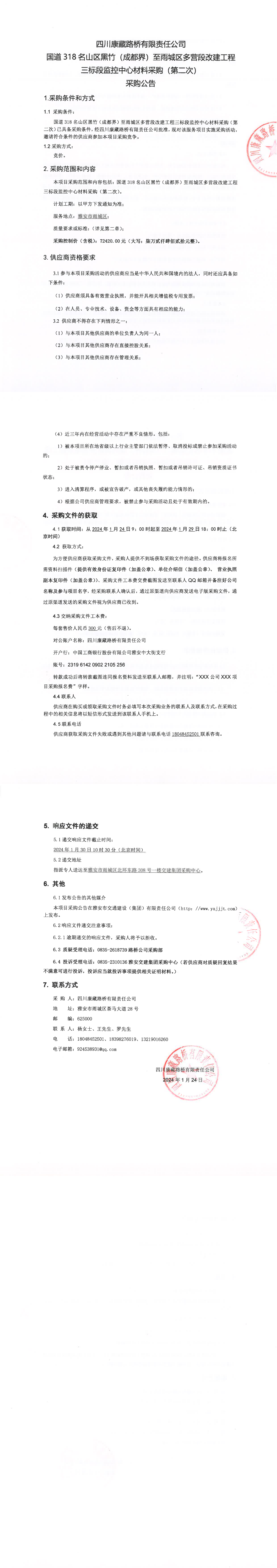 四川康藏路橋有限責任公司國道318名山區(qū)黑竹(成都界)至雨城區(qū)多營段改建工程三標段監(jiān)控中心材料采購(第二次)采購公告