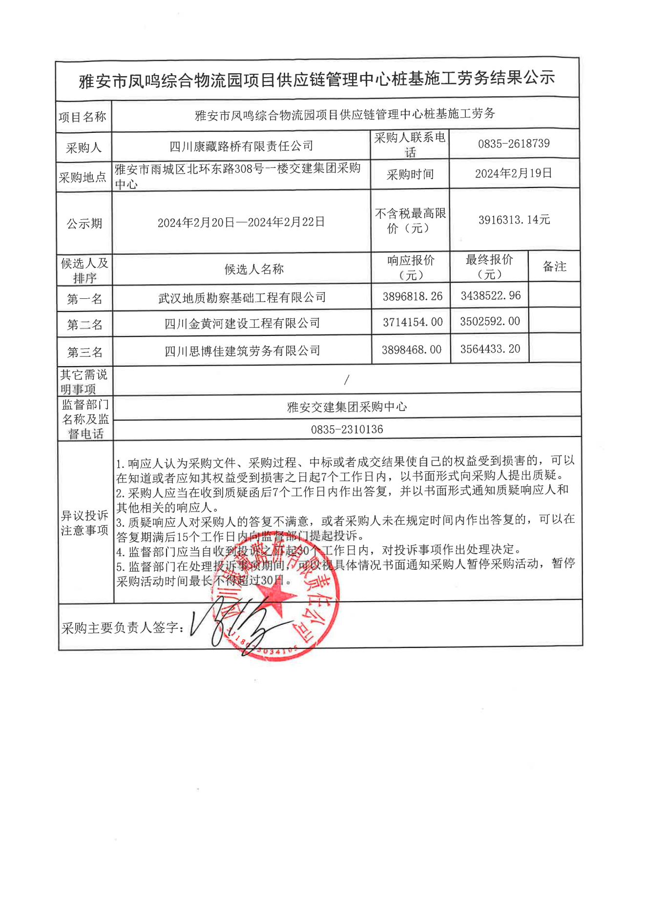 四川康藏路橋有限責任公司雅安市鳳鳴綜合物流園項目供應(yīng)鏈管理中心樁基施工勞務(wù)結(jié)果公示