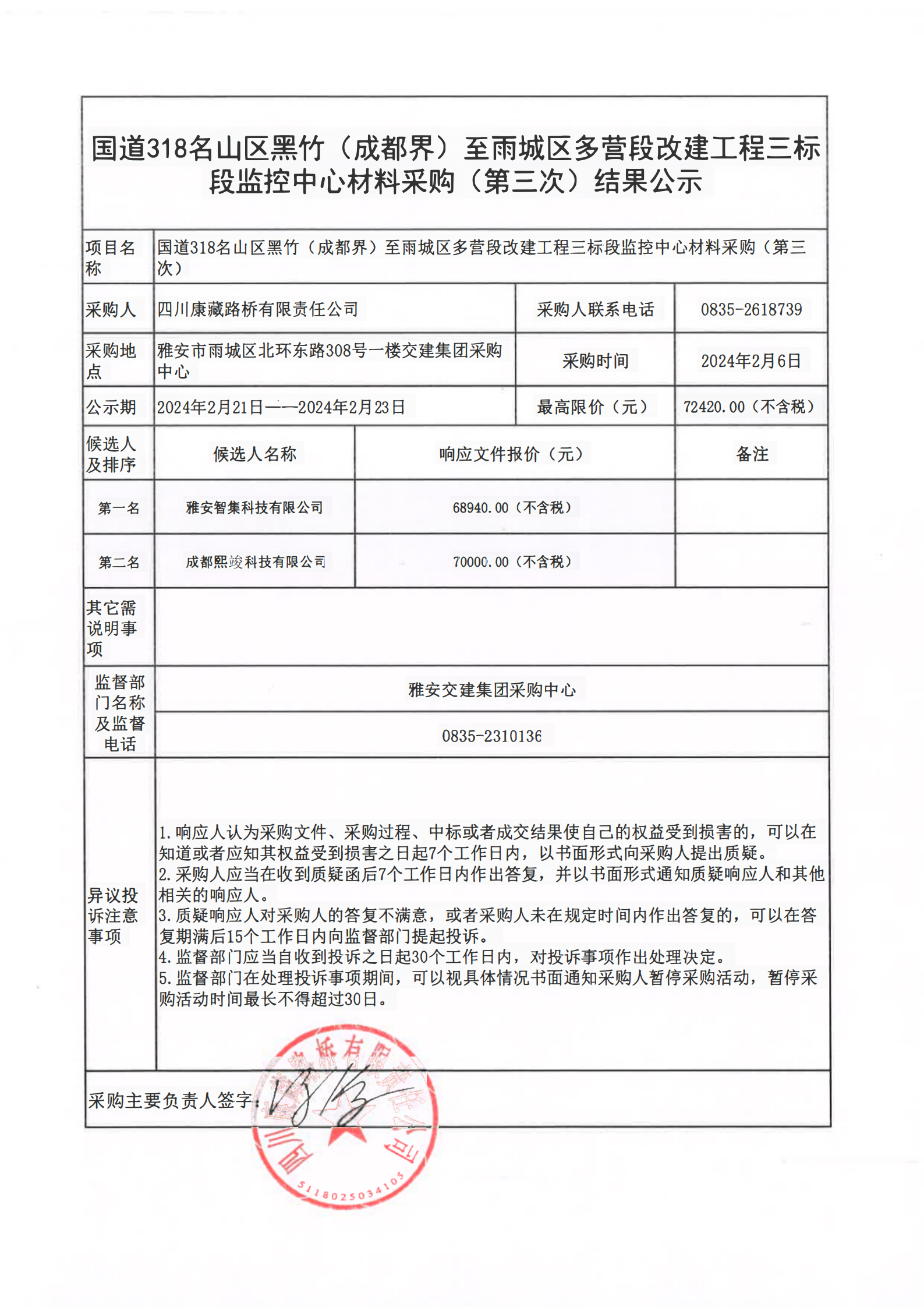 四川康藏路橋有限責(zé)任公司國道318名山區(qū)黑竹(成都界)至雨城區(qū)多營段改建工程三標段監(jiān)控中心材料采購(第三次)結(jié)果公示